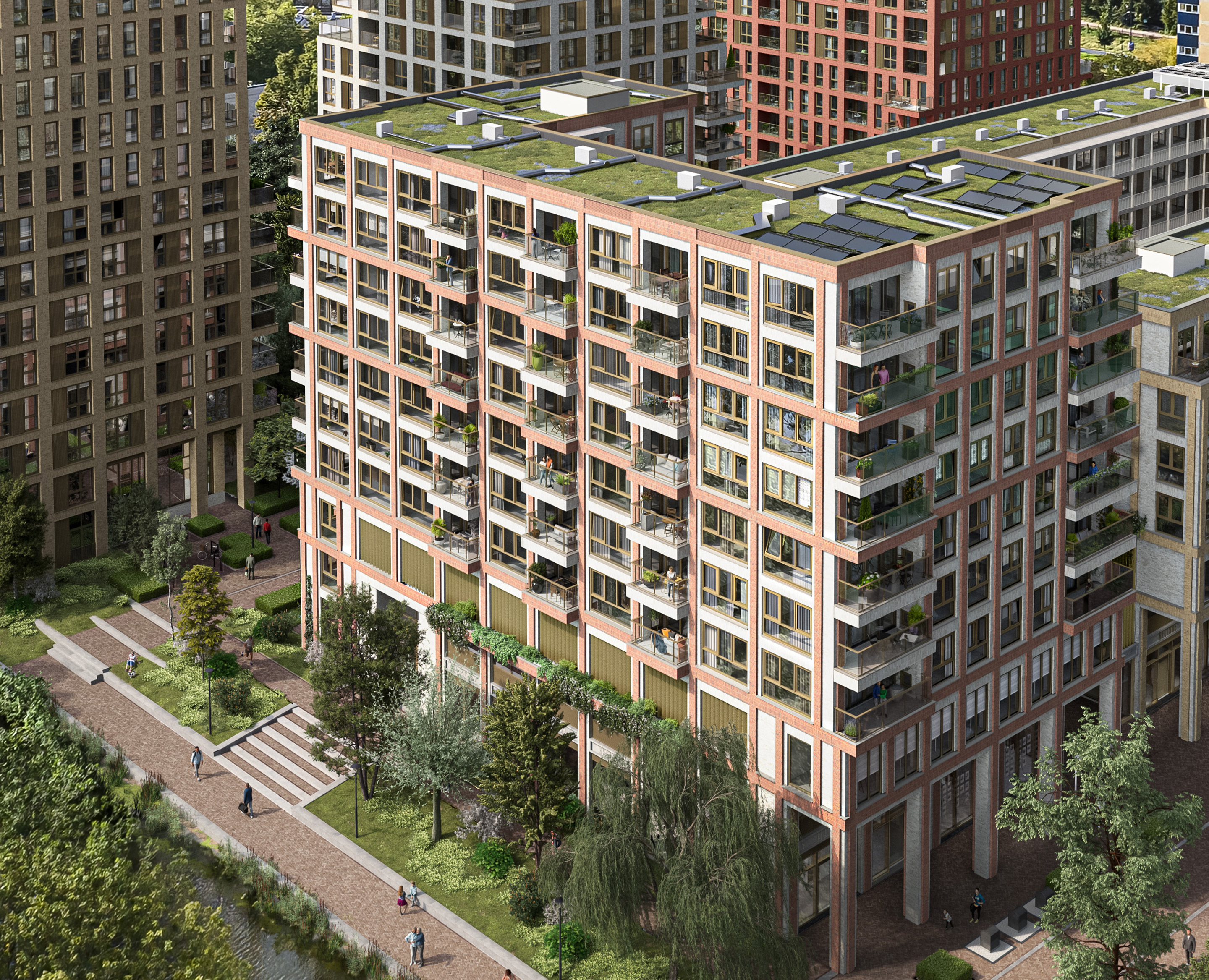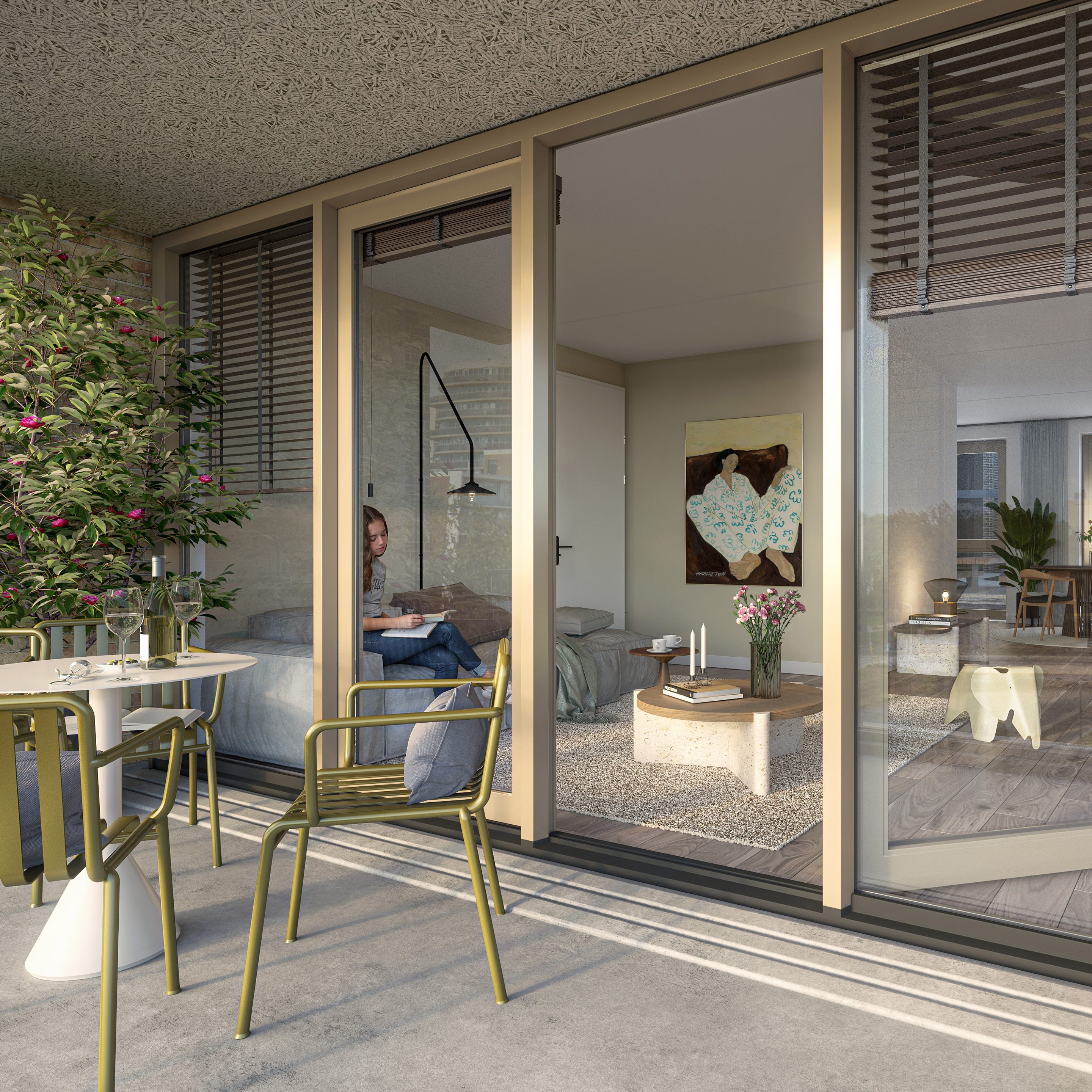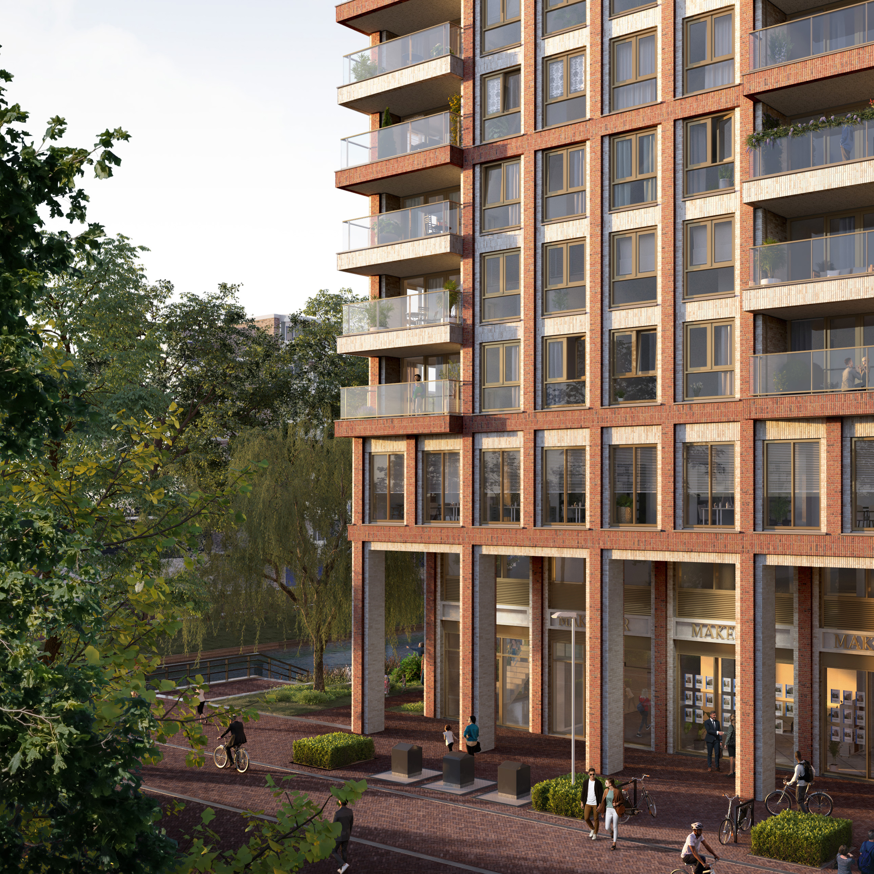 Best of both worldsIn San Francisco komen stad en groen letterlijk samen. Het gebouw wordt aan de ene zijde geflankeerd door het levendige marktplein, terwijl je aan de andere kant uitkijkt op de lommerrijke, autoluwe straat. De fraaie plantenbak aan de gevel en de daktuin op de derde verdieping dragen aan dit groene karakter bij. Wanneer je het gebouw binnenstapt, ervaar je hoe bijzonder het is. Dat begint al bij de royale entree, die fraai gesitueerd is aan de waterzijde. De grandeur van San Francisco is overal voelbaar en zichtbaar, of je nu in een van de vier stadswoningen woont met je eigen voortuin aan het groen, of in een van de appartementen met privé buitenruimte(n). De twee- en driekamerappartementen hebben veel lichtinval. Daarnaast worden de woningen voorzien van een badkamer en keuken. In het hart van het gebouw vind je de fietsenstalling en er zijn 25 parkeerplaatsen te koop voor bewoners van San Francisco.