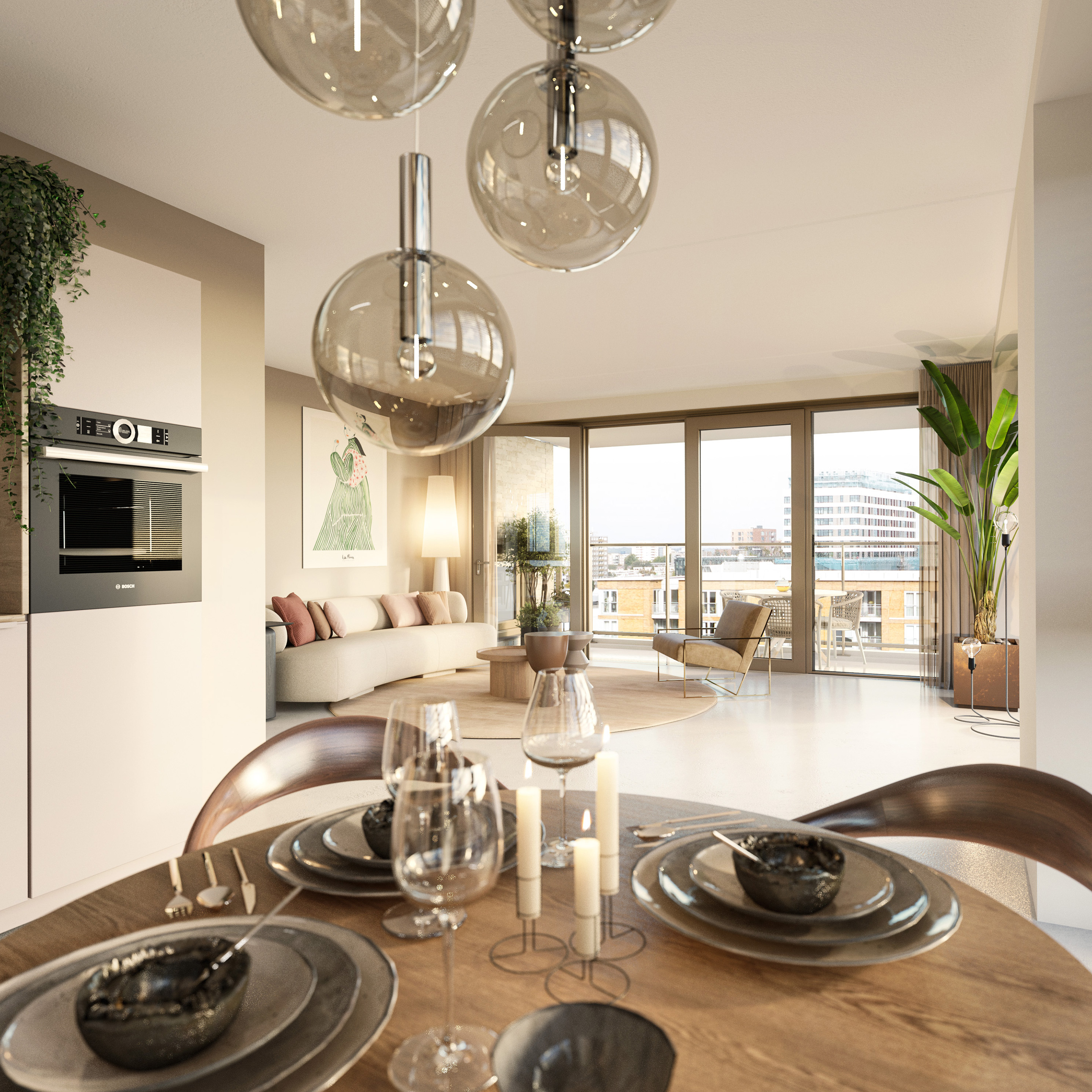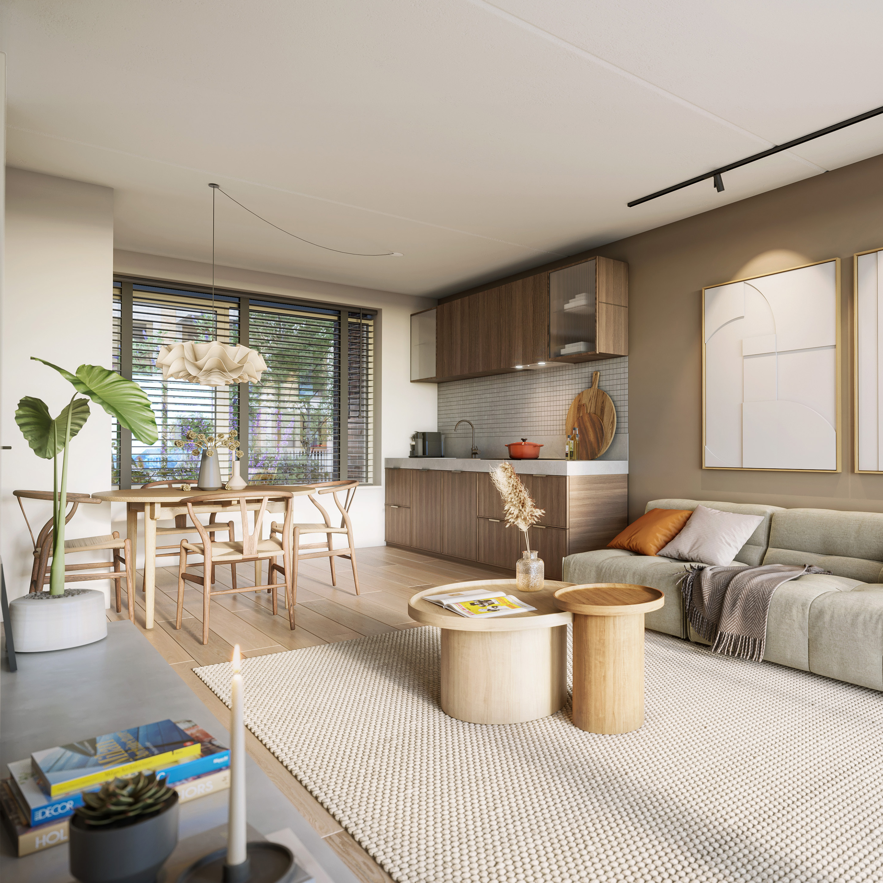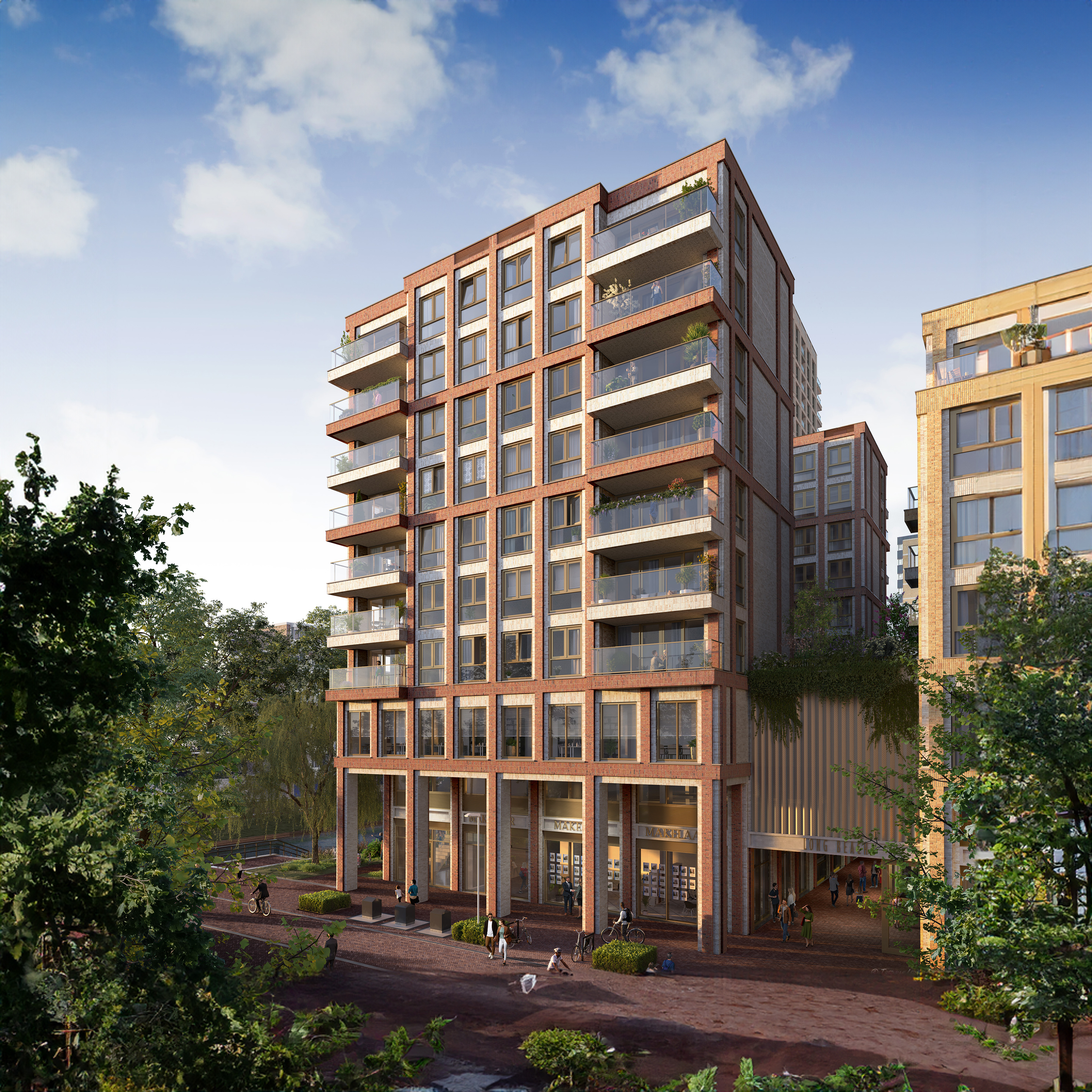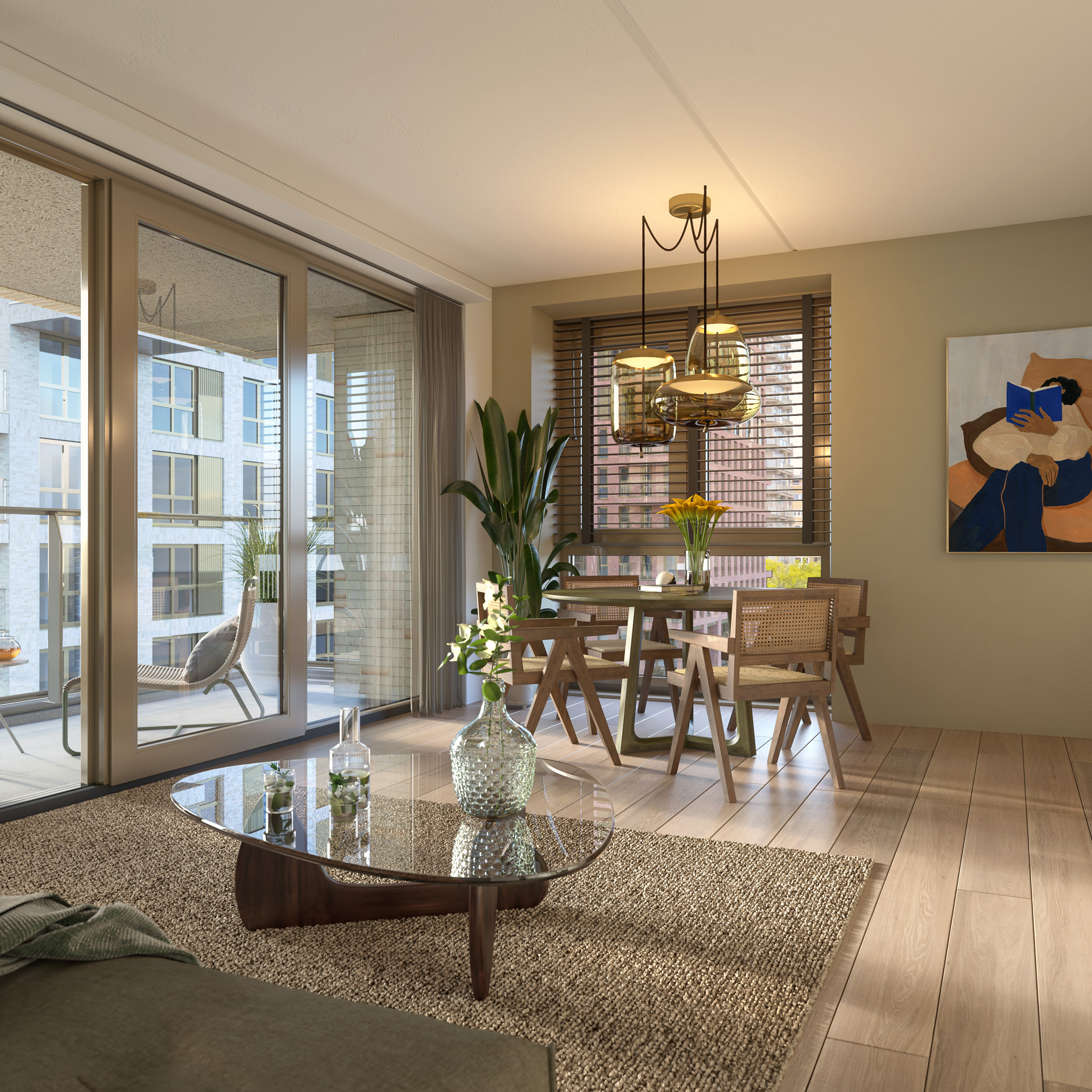 Best of both worldsIn San Francisco komen stad en groen letterlijk samen. Het gebouw wordt aan de ene zijde geflankeerd door het levendige marktplein, terwijl je aan de andere kant uitkijkt op de lommerrijke, autoluwe straat. De fraaie plantenbak aan de gevel en de daktuin op de derde verdieping dragen aan dit groene karakter bij. Wanneer je het gebouw binnenstapt, ervaar je hoe bijzonder het is. Dat begint al bij de royale entree, die fraai gesitueerd is aan de waterzijde. De grandeur van San Francisco is overal voelbaar en zichtbaar, of je nu in een van de vier stadswoningen woont met je eigen voortuin aan het groen, of in een van de appartementen met privé buitenruimte(n). De twee- en driekamerappartementen hebben veel lichtinval. Daarnaast worden de woningen voorzien van een badkamer en keuken. In het hart van het gebouw vind je de fietsenstalling en er zijn 25 parkeerplaatsen te koop voor bewoners van San Francisco.