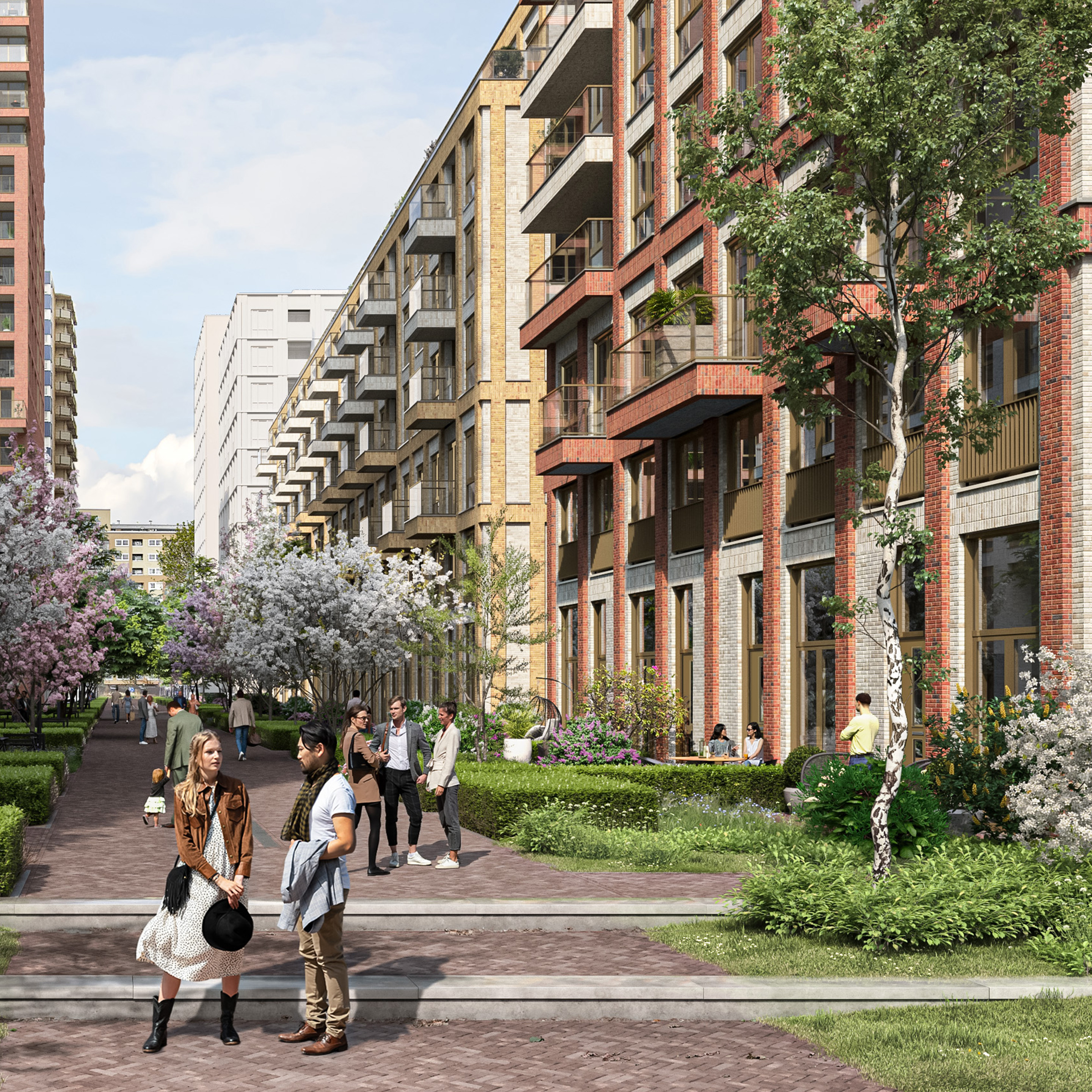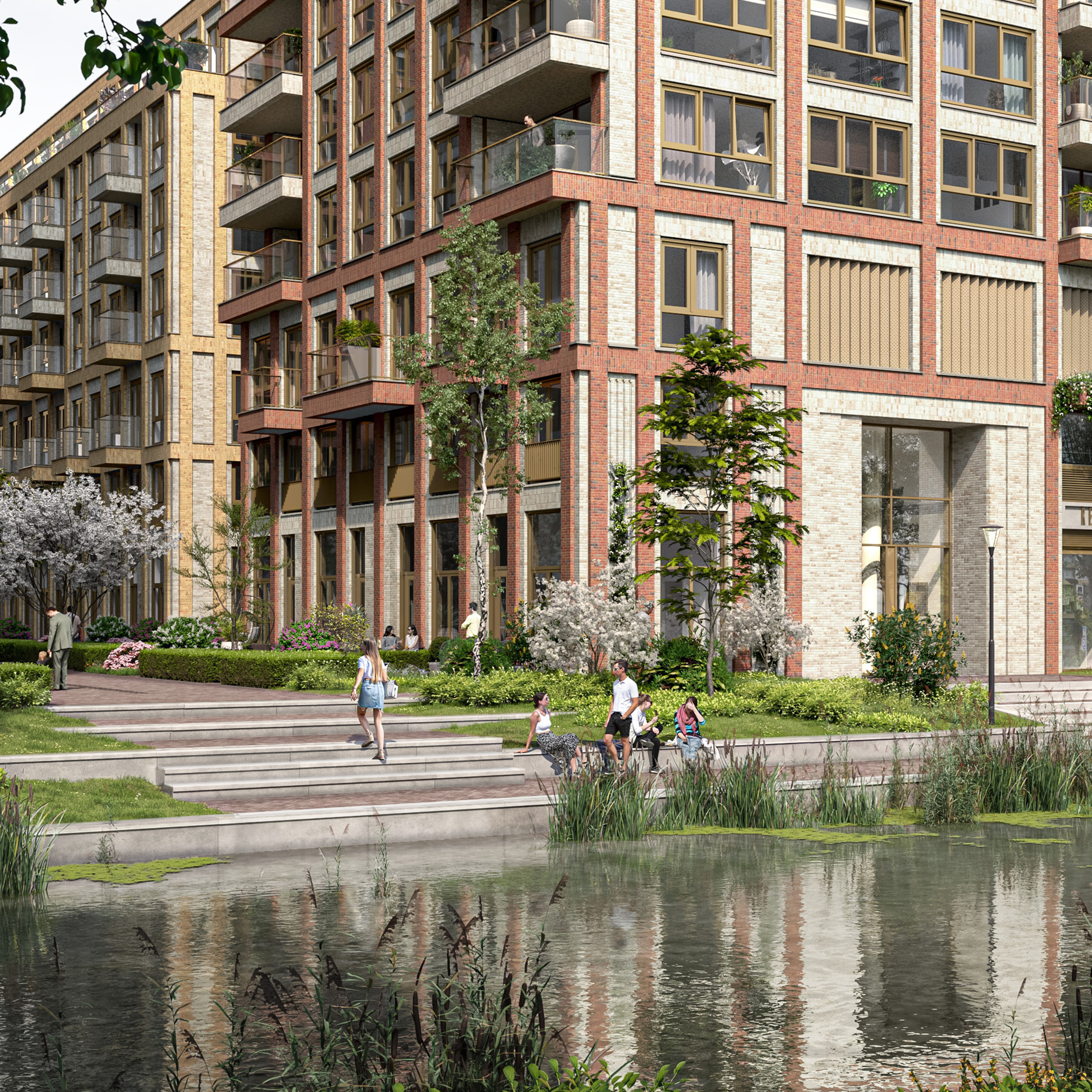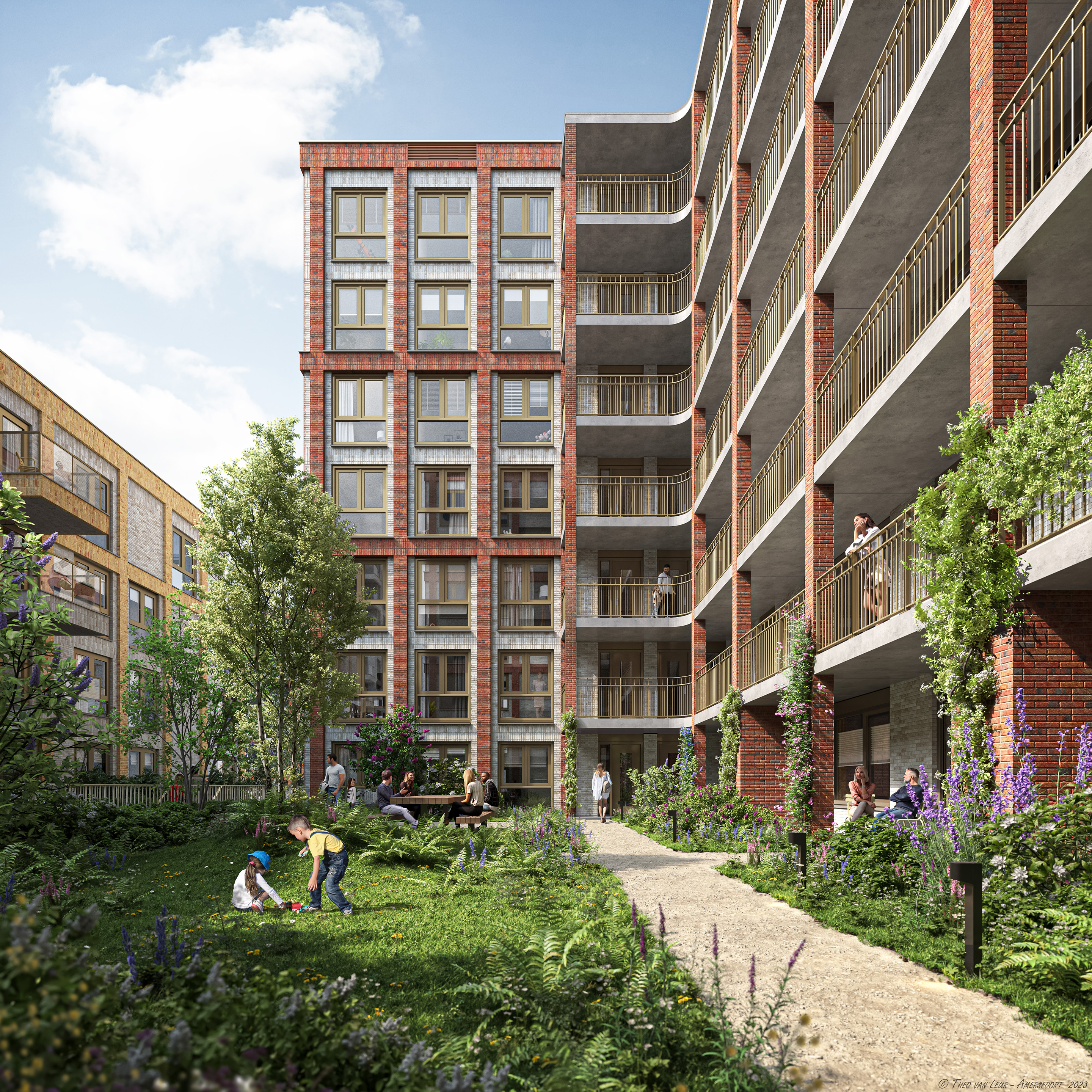 “De architectuur van het project combineert de kenmerken van de 60’er jaren bebouwing van Schalkwijk en de historische bebouwing van de binnenstad van Haarlem en maakt zo van twee werelden één.”